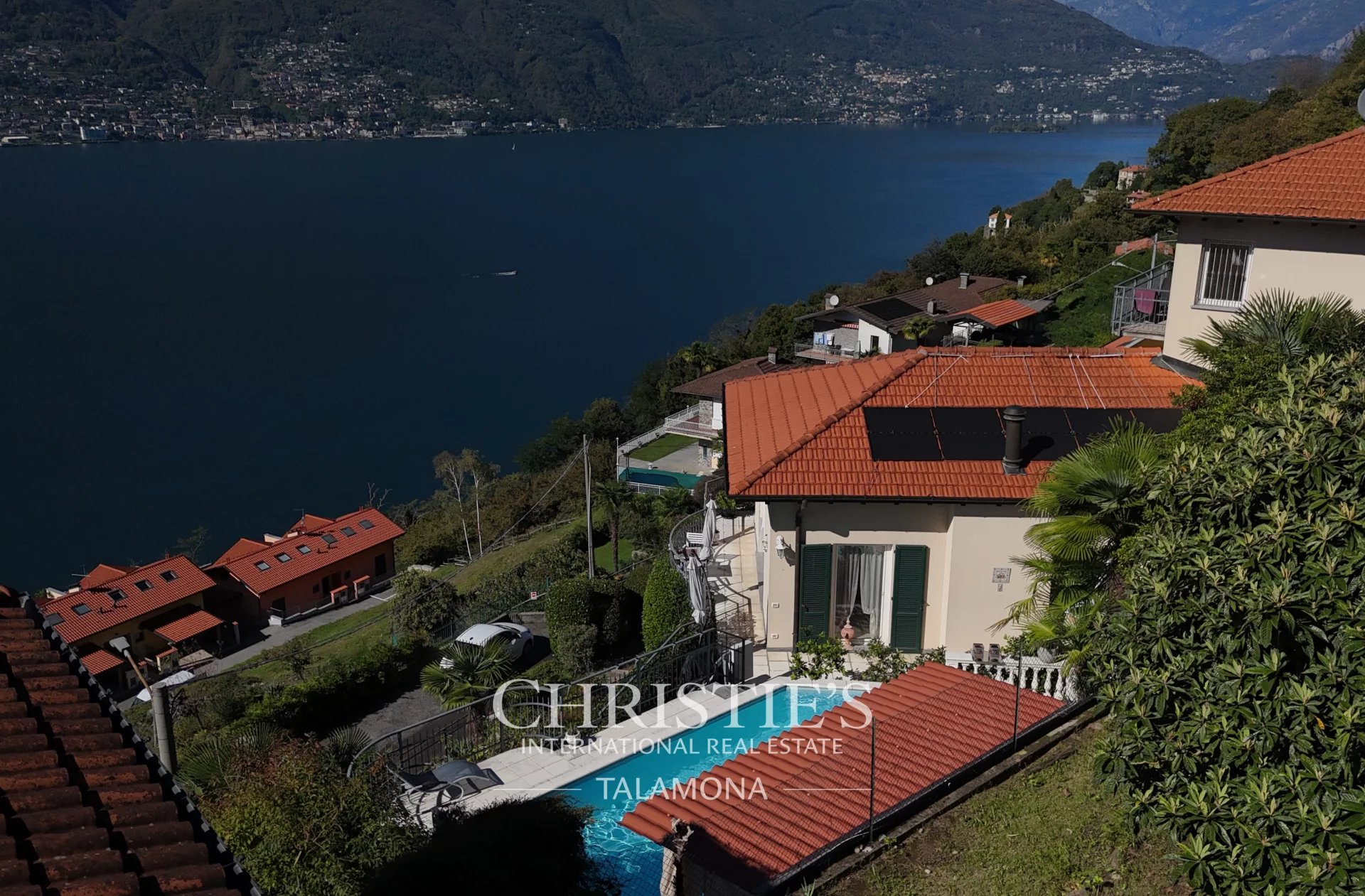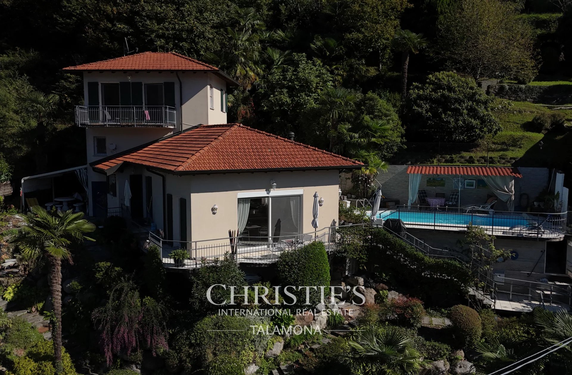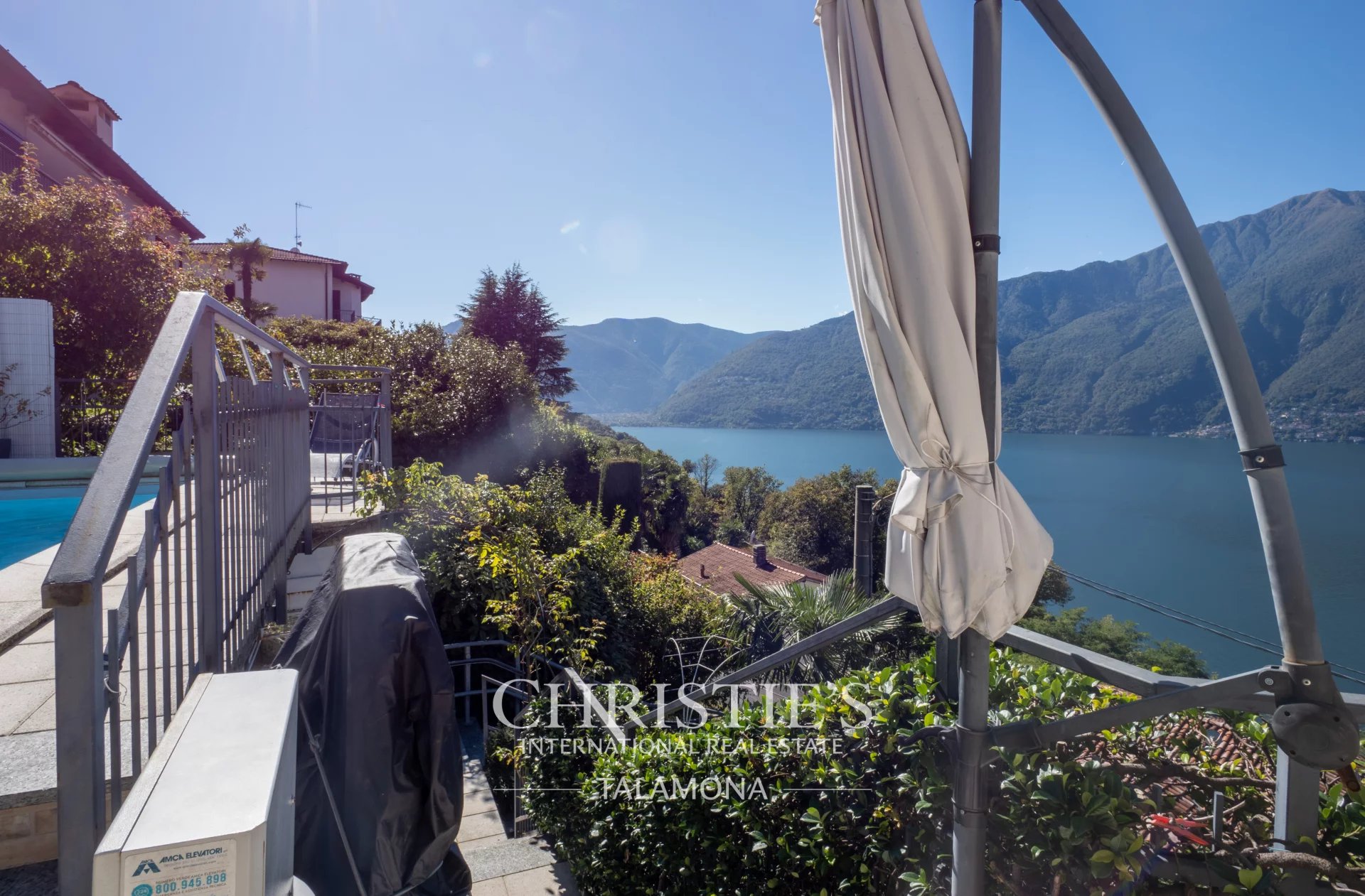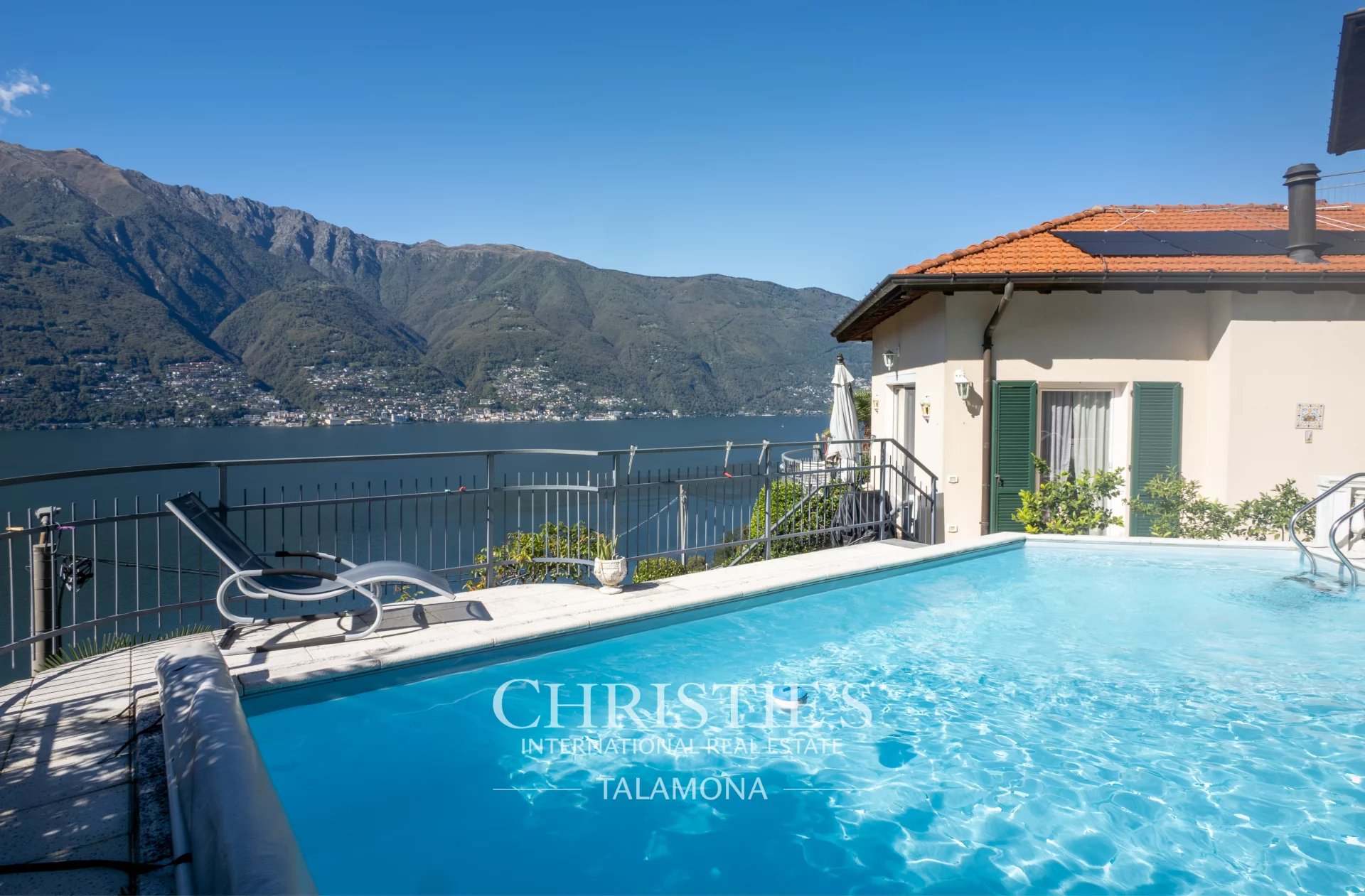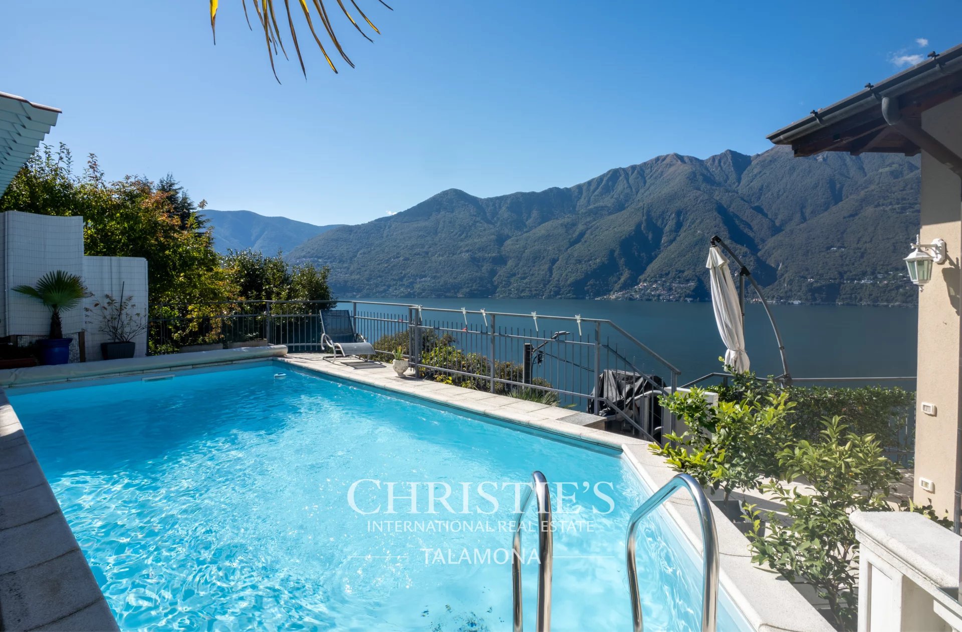 This exquisite villa boasts a fantastic pool with lake views. Thanks to its hillside location, the view remains unobstructed.