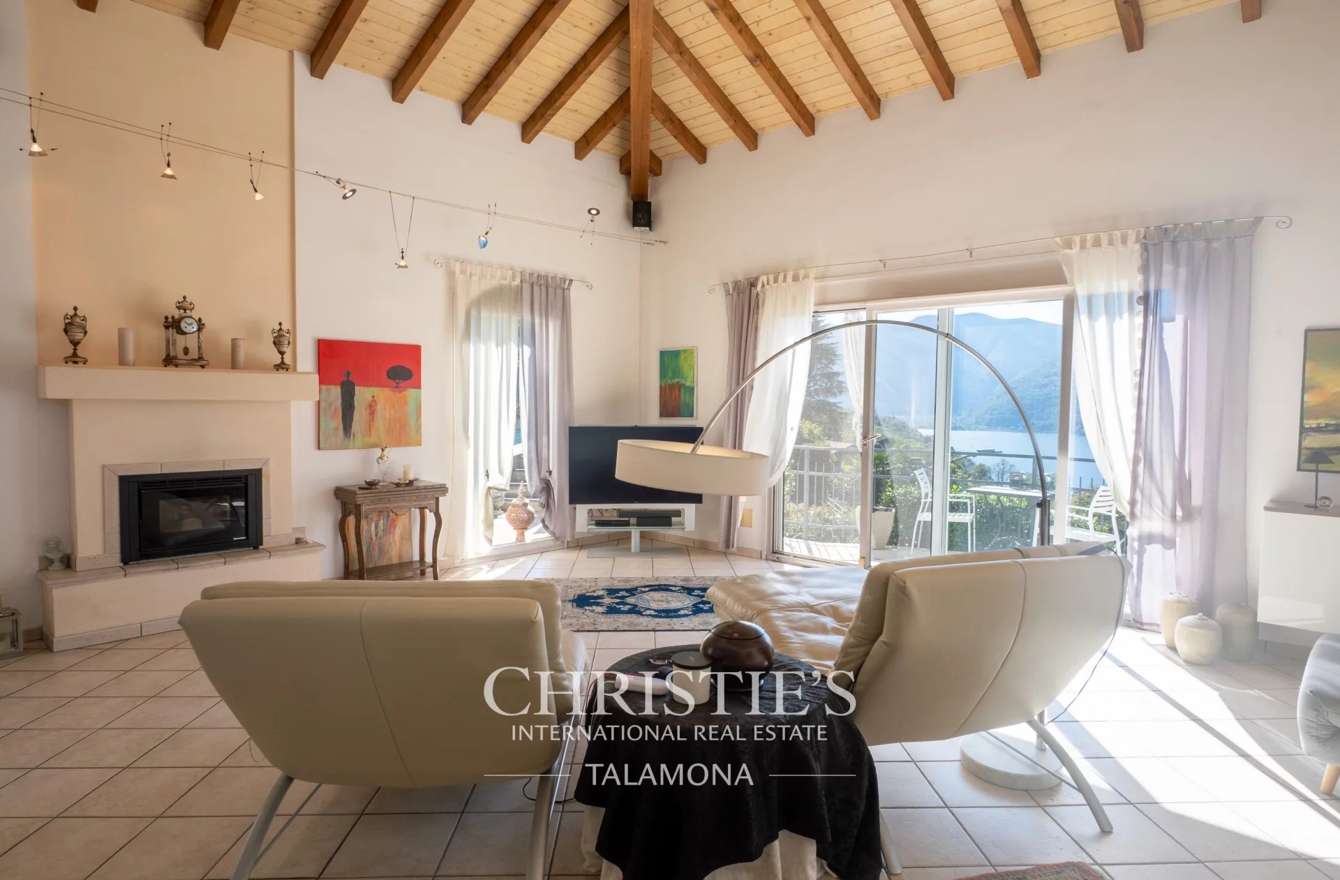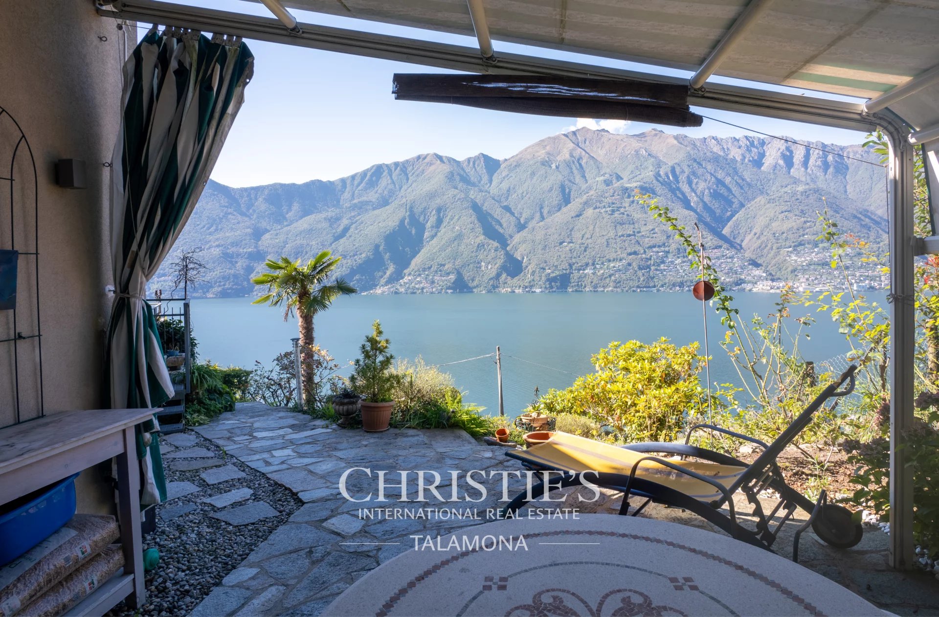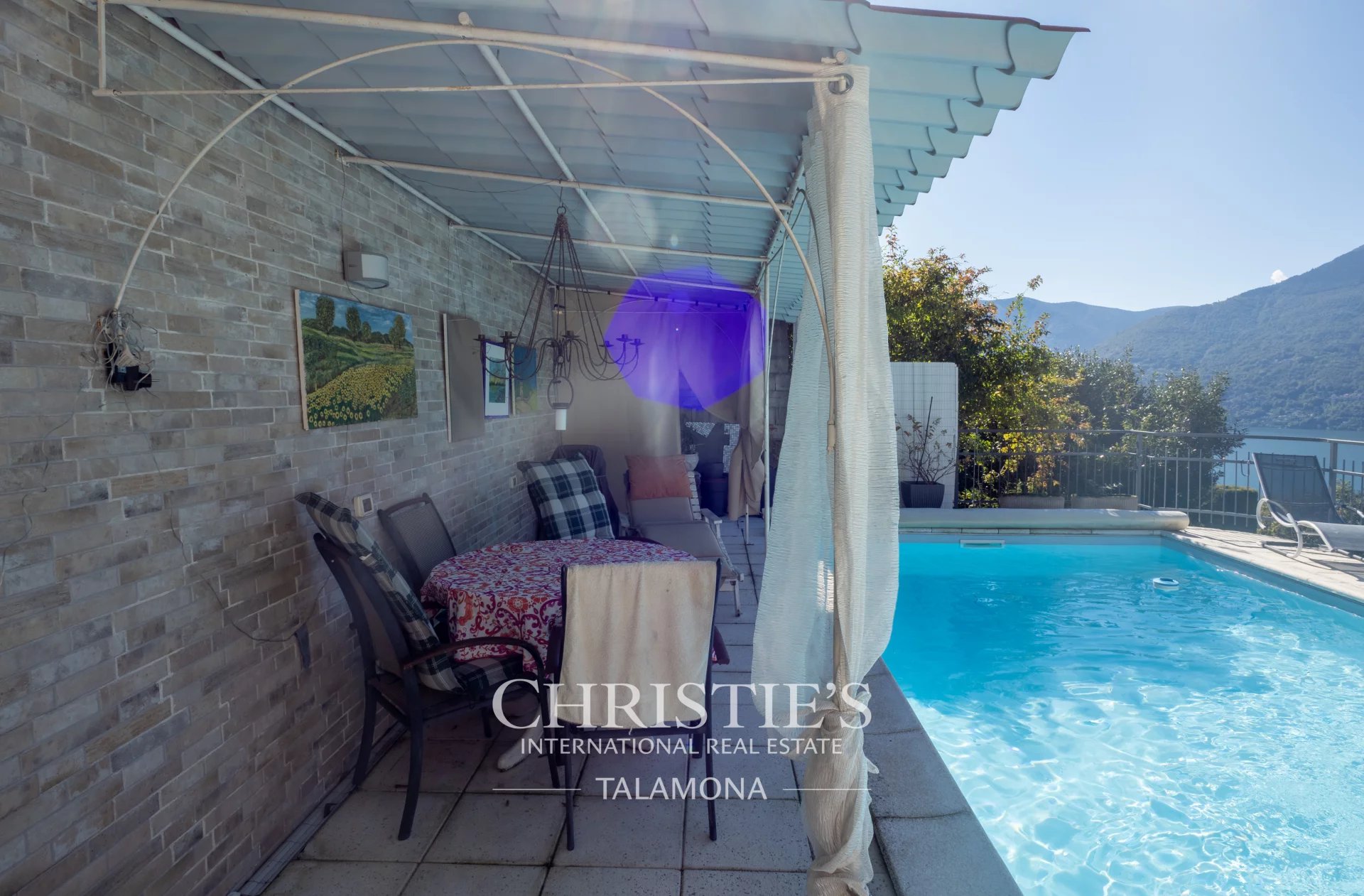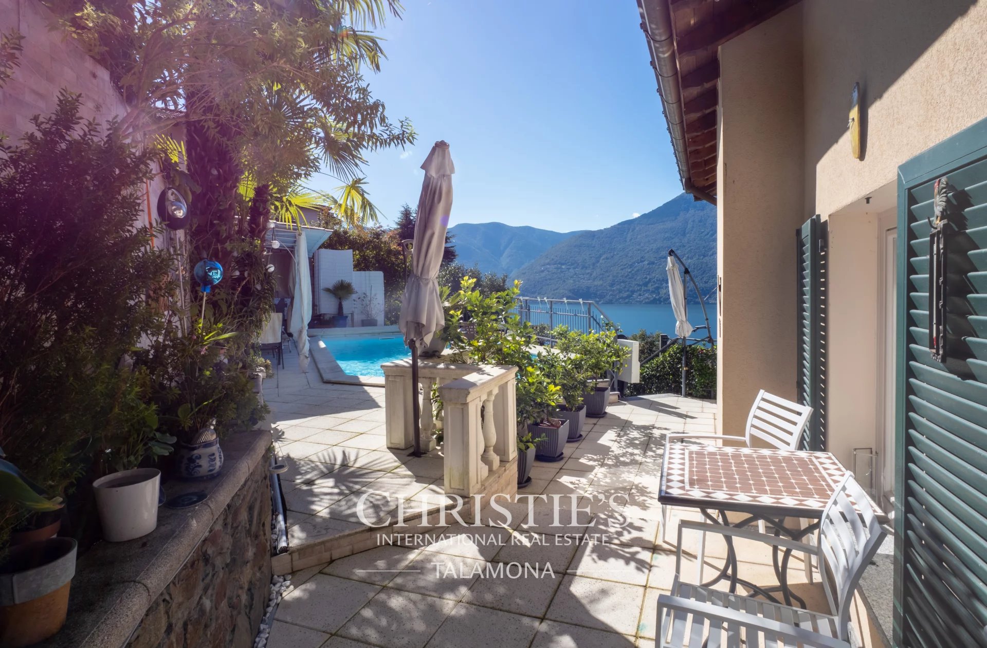 This exquisite villa boasts a fantastic pool with lake views. Thanks to its hillside location, the view remains unobstructed.